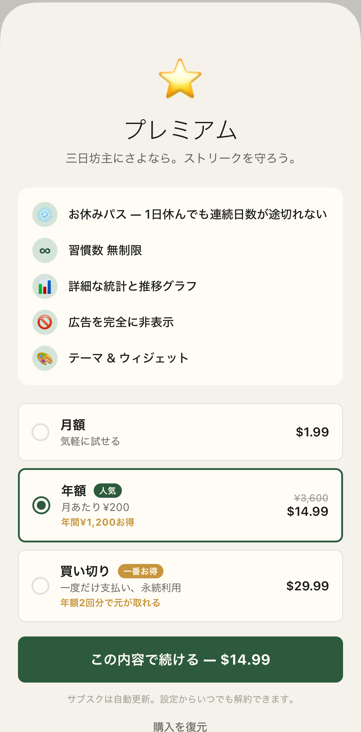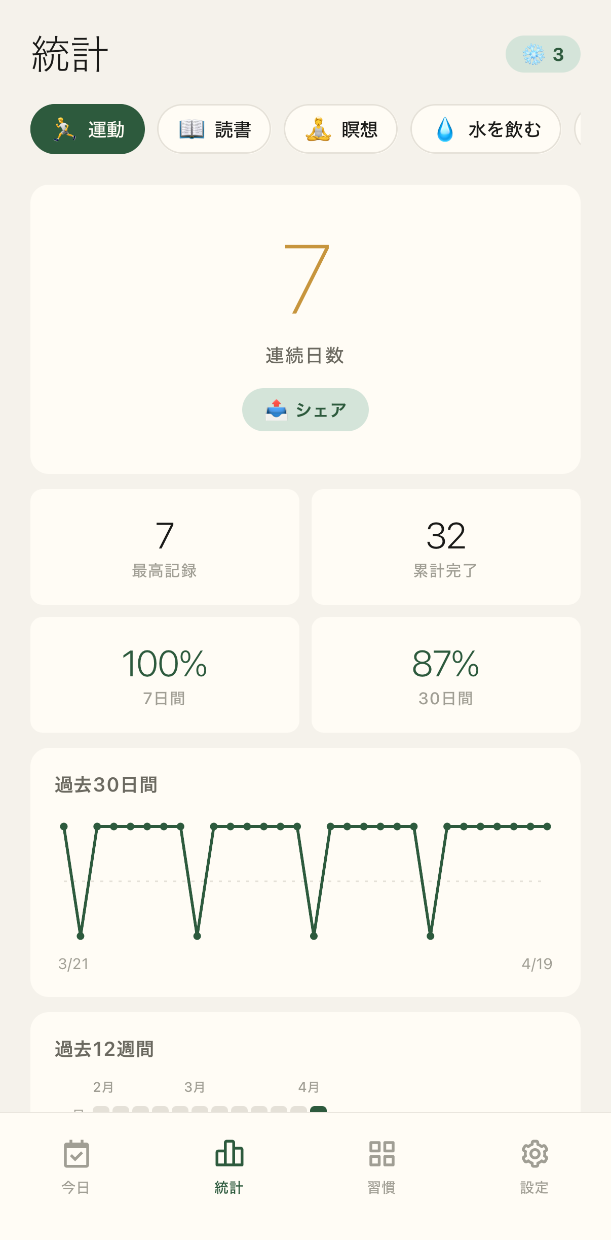 月 3 回のお休みパスと、週次・N 日ごとの自由な頻度。生活のほうに、アプリが合わせます。 Three freezes a month, and cadences from daily to every-N-days. The app bends to your life, not the other way around.
