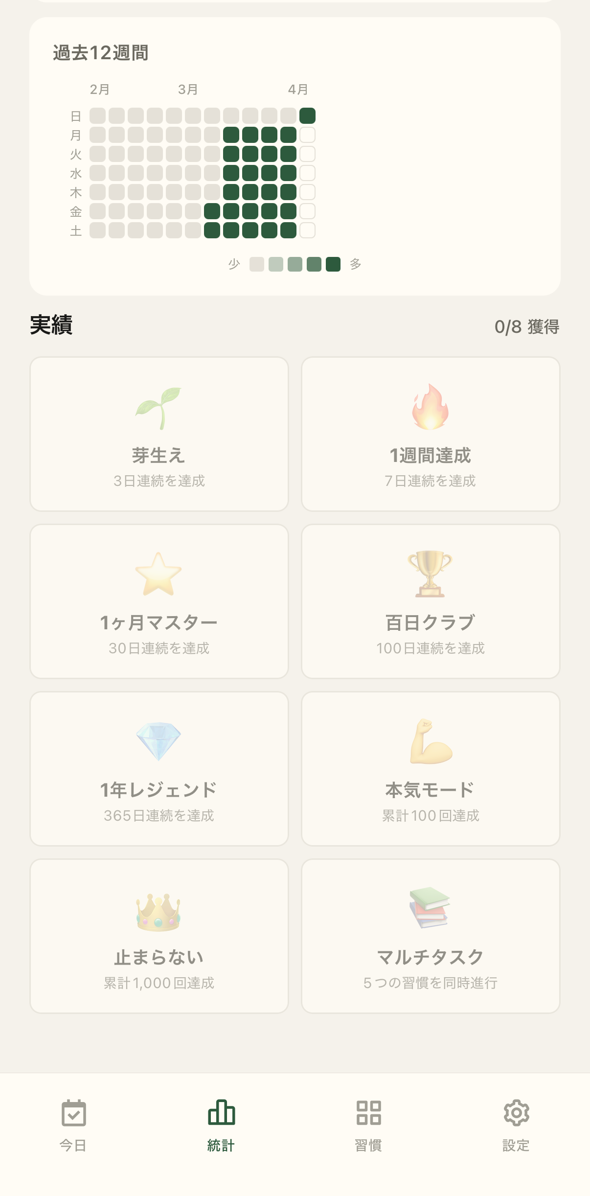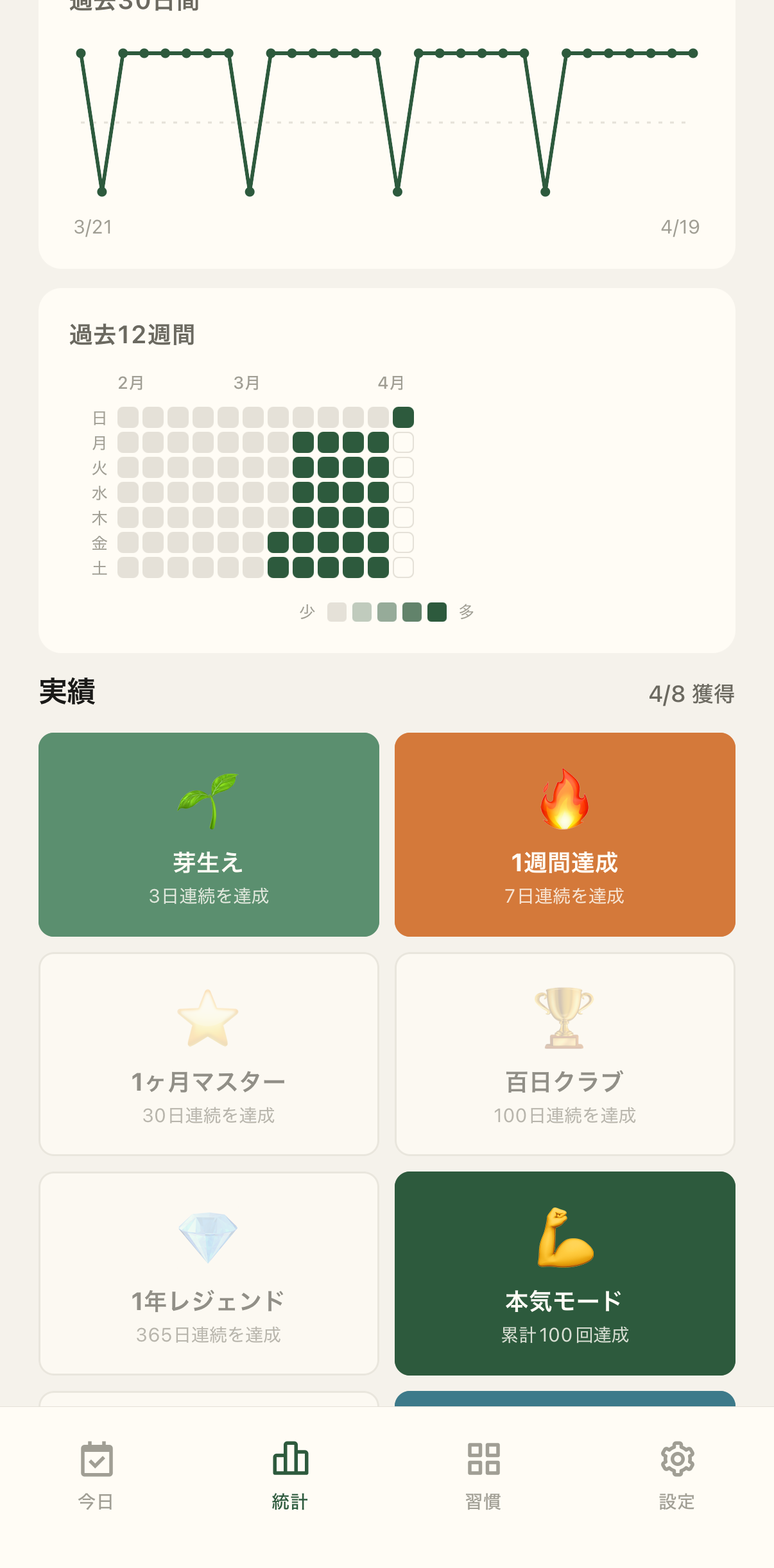 ヒートマップ、推移、実績。あなたの軌跡を静かに描きます。 Heatmap, trend, achievements. Your quiet trail, drawn on paper.