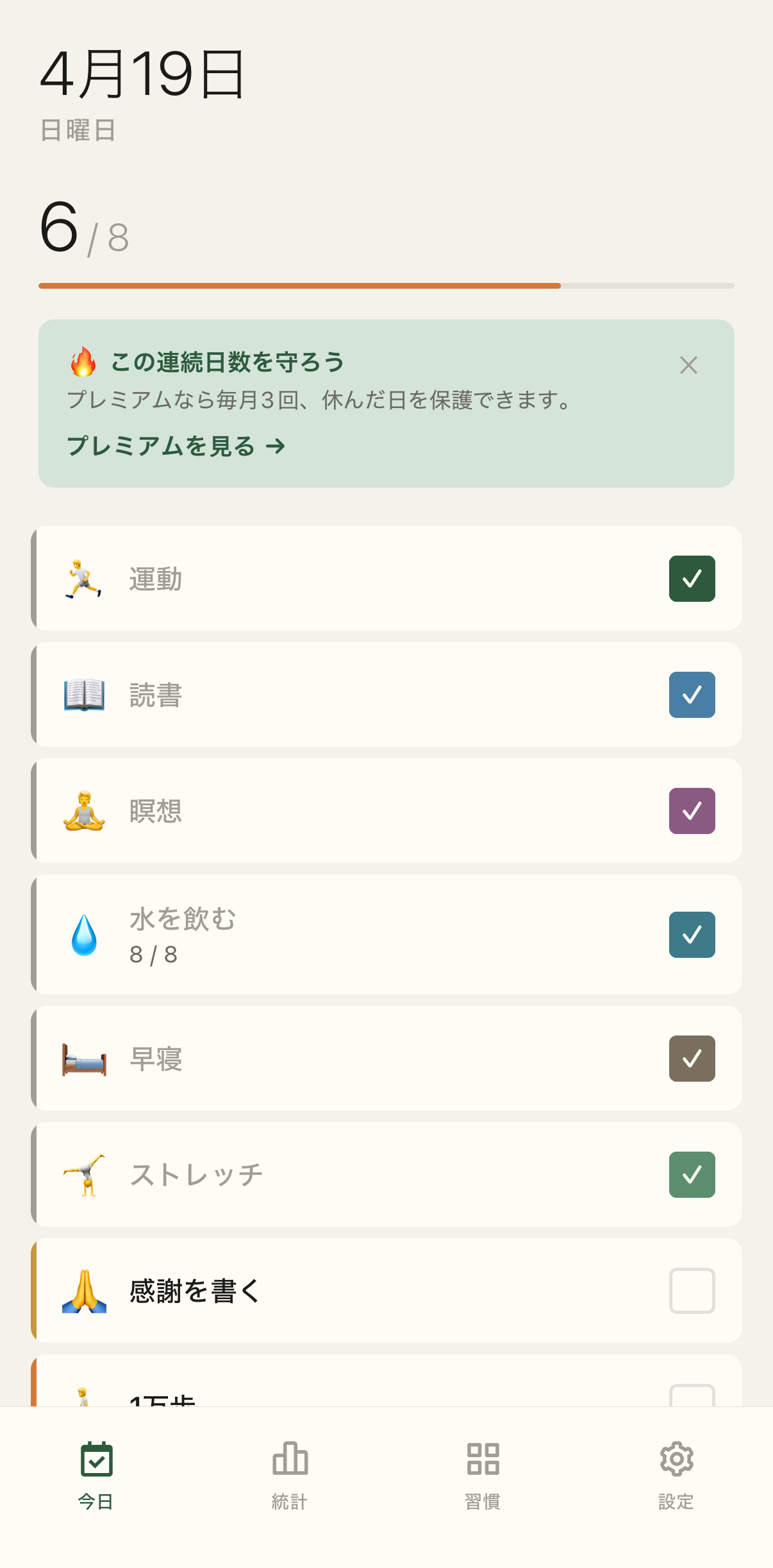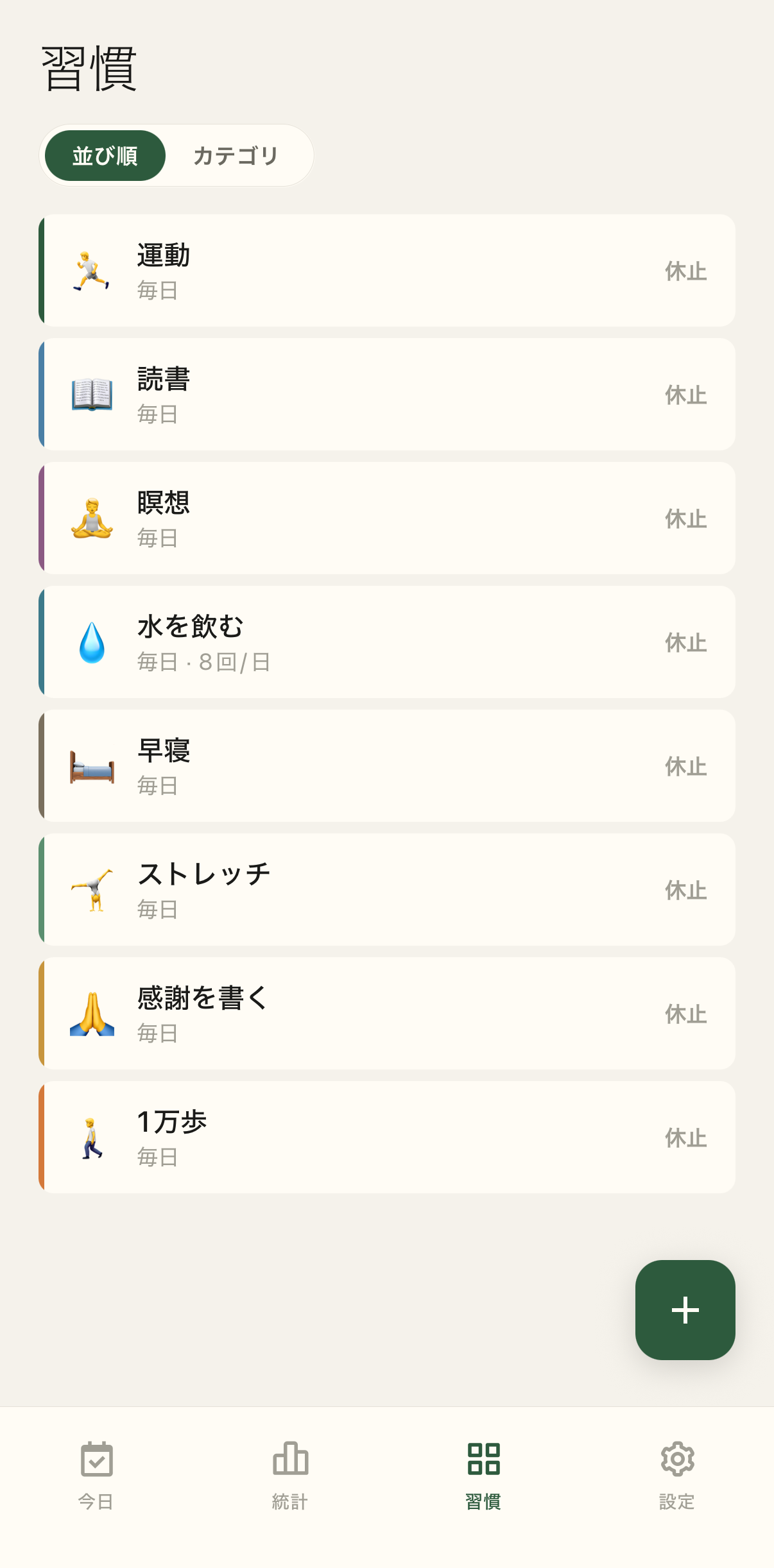 運動も、読書も、水も。毎日・週次・N 日ごと、思いのままに。 Exercise, reading, water. Daily, weekly, or every N days — on your terms.